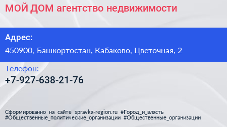 МОЙ ДОМ, агентство недвижимости по адресу 450900, Башкортостан, Кабаково, Цветочная, 2 в дальнейшем Организация, размещена в следующих категориях: