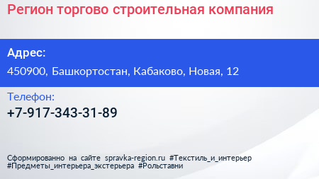 Регион, торгово-строительная компания по адресу 450900, Башкортостан, Кабаково, Новая, 12 в дальнейшем Организация, размещена в следующих категориях: