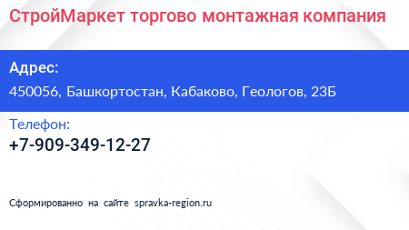 СтройМаркет, торгово-монтажная компания по адресу 450056, Башкортостан, Кабаково, Геологов, 23Б в дальнейшем Организация, размещена в следующих категориях: