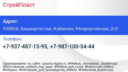 СтройПласт по адресу 450056, Башкортостан, Кабаково, Мокроусовская, 2/2 в дальнейшем Организация, размещена в следующих категориях:
