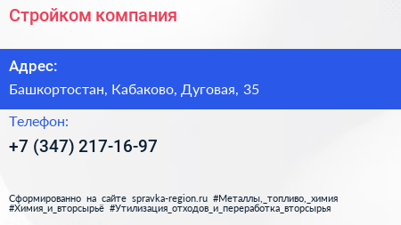 Стройком, компания по адресу Башкортостан, Кабаково, Дуговая, 35 в дальнейшем Организация, размещена в следующих категориях: