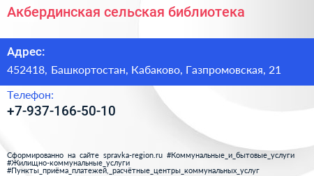 Акбердинская сельская библиотека по адресу 452418, Башкортостан, Кабаково, Газпромовская, 21 в дальнейшем Организация, размещена в следующих категориях: