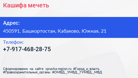 Кашифа, мечеть по адресу 450591, Башкортостан, Кабаково, Южная, 21 в дальнейшем Организация, размещена в следующих категориях: