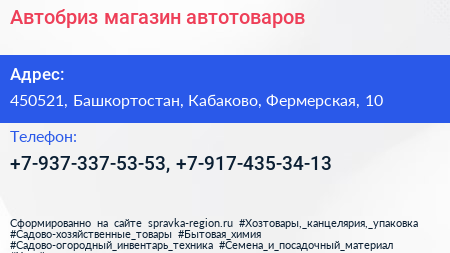 Автобриз, магазин автотоваров по адресу 450521, Башкортостан, Кабаково, Фермерская, 10 в дальнейшем Организация, размещена в следующих категориях: