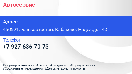 Автосервис по адресу 450521, Башкортостан, Кабаково, Надежды, 43 в дальнейшем Организация, размещена в следующих категориях: