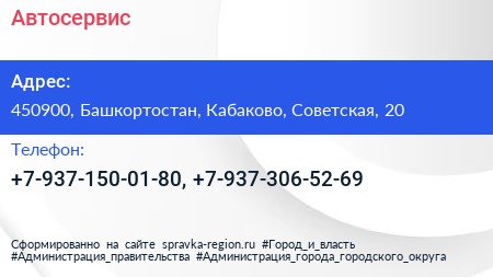 Автосервис по адресу 450900, Башкортостан, Кабаково, Советская, 20 в дальнейшем Организация, размещена в следующих категориях: