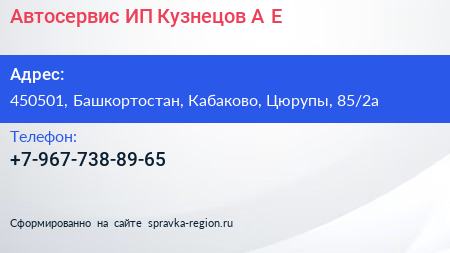 Автосервис, ИП Кузнецов А.Е. по адресу 450501, Башкортостан, Кабаково, Цюрупы, 85/2а в дальнейшем Организация, размещена в следующих категориях: