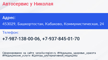 Автосервис у Николая по адресу 453029, Башкортостан, Кабаково, Коммунистическая, 24 в дальнейшем Организация, размещена в следующих категориях: