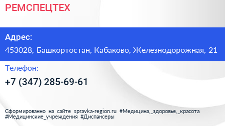 РЕМСПЕЦТЕХ по адресу 453028, Башкортостан, Кабаково, Железнодорожная, 21 в дальнейшем Организация, размещена в следующих категориях: