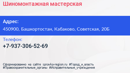 Шиномонтажная мастерская по адресу 450900, Башкортостан, Кабаково, Советская, 20Б в дальнейшем Организация, размещена в следующих категориях: