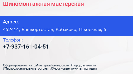 Шиномонтажная мастерская по адресу 452414, Башкортостан, Кабаково, Школьная, 6 в дальнейшем Организация, размещена в следующих категориях: