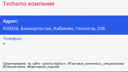 Techamo, компания по адресу 450056, Башкортостан, Кабаково, Геологов, 23Б в дальнейшем Организация, размещена в следующих категориях: