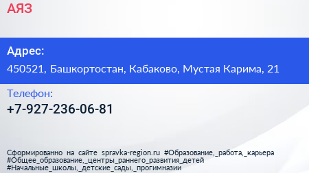 АЯЗ по адресу 450521, Башкортостан, Кабаково, Мустая Карима, 21 в дальнейшем Организация, размещена в следующих категориях: