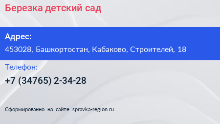 Березка, детский сад по адресу 453028, Башкортостан, Кабаково, Строителей, 18 в дальнейшем Организация, размещена в следующих категориях: