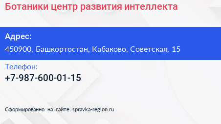 Ботаники, центр развития интеллекта по адресу 450900, Башкортостан, Кабаково, Советская, 15 в дальнейшем Организация, размещена в следующих категориях: