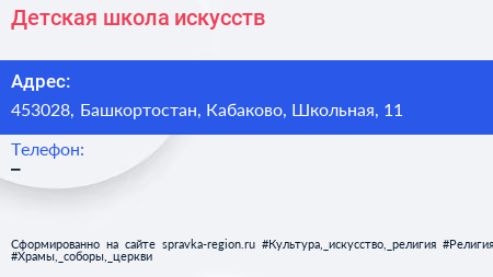 Детская школа искусств по адресу 453028, Башкортостан, Кабаково, Школьная, 11 в дальнейшем Организация, размещена в следующих категориях: