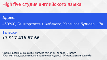 High five, студия английского языка по адресу 450900, Башкортостан, Кабаково, Хасанова бульвар, 17а в дальнейшем Организация, размещена в следующих категориях: