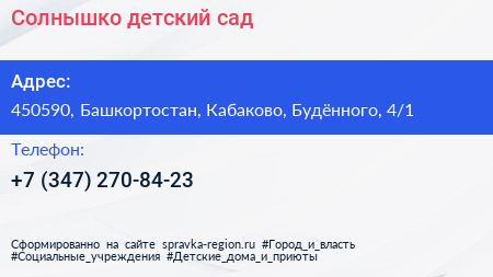 Солнышко, детский сад по адресу 450590, Башкортостан, Кабаково, Будённого, 4/1 в дальнейшем Организация, размещена в следующих категориях: