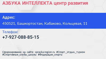 АЗБУКА ИНТЕЛЛЕКТА, центр развития по адресу 450521, Башкортостан, Кабаково, Кольцевая, 11 в дальнейшем Организация, размещена в следующих категориях: