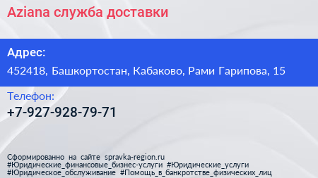 Aziana, служба доставки по адресу 452418, Башкортостан, Кабаково, Рами Гарипова, 15 в дальнейшем Организация, размещена в следующих категориях: