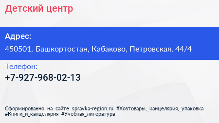 Детский центр по адресу 450501, Башкортостан, Кабаково, Петровская, 44/4 в дальнейшем Организация, размещена в следующих категориях: