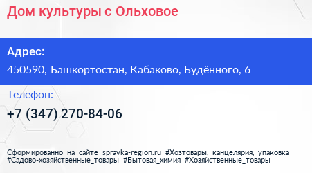 Дом культуры, с. Ольховое по адресу 450590, Башкортостан, Кабаково, Будённого, 6 в дальнейшем Организация, размещена в следующих категориях: