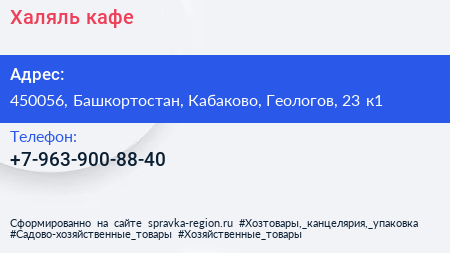 Халяль, кафе по адресу 450056, Башкортостан, Кабаково, Геологов, 23 к1 в дальнейшем Организация, размещена в следующих категориях: