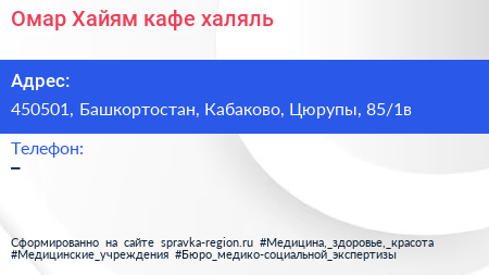 Омар Хайям, кафе-халяль по адресу 450501, Башкортостан, Кабаково, Цюрупы, 85/1в в дальнейшем Организация, размещена в следующих категориях: