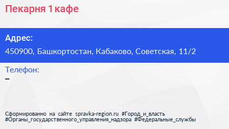 Пекарня №1, кафе по адресу 450900, Башкортостан, Кабаково, Советская, 11/2 в дальнейшем Организация, размещена в следующих категориях:
