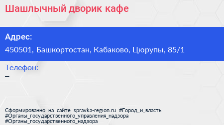 Шашлычный дворик, кафе по адресу 450501, Башкортостан, Кабаково, Цюрупы, 85/1 в дальнейшем Организация, размещена в следующих категориях: