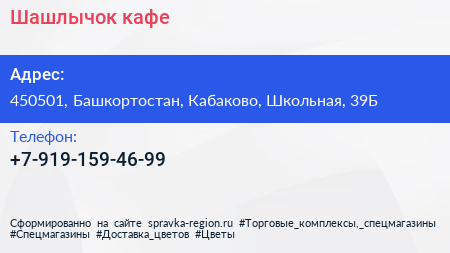 Шашлычок, кафе по адресу 450501, Башкортостан, Кабаково, Школьная, 39Б в дальнейшем Организация, размещена в следующих категориях: