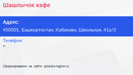 Шашлычок, кафе по адресу 450501, Башкортостан, Кабаково, Школьная, 41а/3 в дальнейшем Организация, размещена в следующих категориях:
