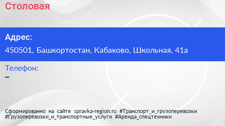 Столовая по адресу 450501, Башкортостан, Кабаково, Школьная, 41а в дальнейшем Организация, размещена в следующих категориях: