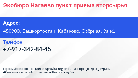Экобюро Нагаево, пункт приема вторсырья по адресу 450900, Башкортостан, Кабаково, Озёрная, 9а к1 в дальнейшем Организация, размещена в следующих категориях: