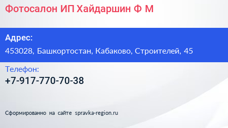 Фотосалон, ИП Хайдаршин Ф.М. по адресу 453028, Башкортостан, Кабаково, Строителей, 45 в дальнейшем Организация, размещена в следующих категориях: