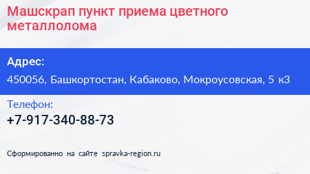 Машскрап, пункт приема цветного металлолома по адресу 450056, Башкортостан, Кабаково, Мокроусовская, 5 к3 в дальнейшем Организация, размещена в следующих категориях: