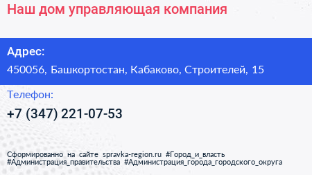 Наш дом, управляющая компания по адресу 450056, Башкортостан, Кабаково, Строителей, 15 в дальнейшем Организация, размещена в следующих категориях:
