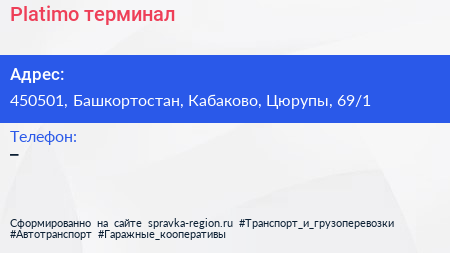 Platimо, терминал по адресу 450501, Башкортостан, Кабаково, Цюрупы, 69/1 в дальнейшем Организация, размещена в следующих категориях: