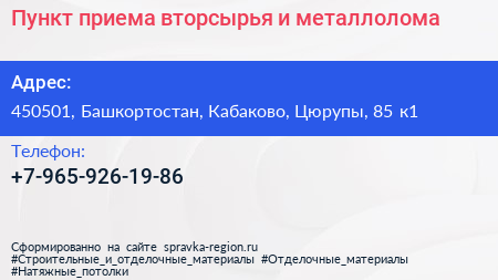 Пункт приема вторсырья и металлолома по адресу 450501, Башкортостан, Кабаково, Цюрупы, 85 к1 в дальнейшем Организация, размещена в следующих категориях: