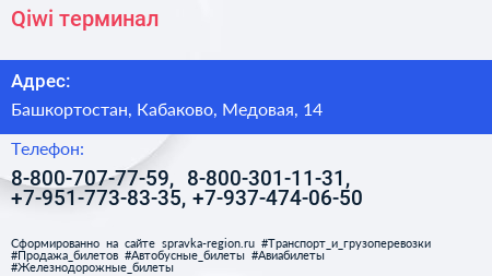 Qiwi, терминал по адресу Башкортостан, Кабаково, Медовая, 14 в дальнейшем Организация, размещена в следующих категориях: