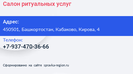 Салон ритуальных услуг по адресу 450501, Башкортостан, Кабаково, Кирова, 4 в дальнейшем Организация, размещена в следующих категориях: