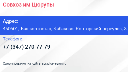 Совхоз им. Цюрупы по адресу 450501, Башкортостан, Кабаково, Конторский переулок, 3 в дальнейшем Организация, размещена в следующих категориях: