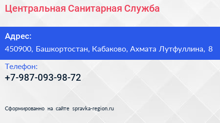 Центральная Санитарная Служба по адресу 450900, Башкортостан, Кабаково, Ахмата Лутфуллина, 8 в дальнейшем Организация, размещена в следующих категориях: