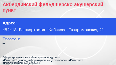 Акбердинский фельдшерско-акушерский пункт по адресу 452418, Башкортостан, Кабаково, Газпромовская, 21 в дальнейшем Организация, размещена в следующих категориях: