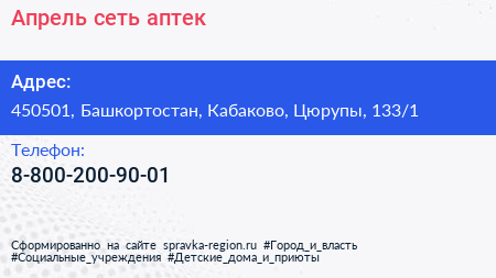 Апрель, сеть аптек по адресу 450501, Башкортостан, Кабаково, Цюрупы, 133/1 в дальнейшем Организация, размещена в следующих категориях: