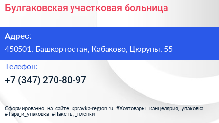 Булгаковская участковая больница по адресу 450501, Башкортостан, Кабаково, Цюрупы, 55 в дальнейшем Организация, размещена в следующих категориях:
