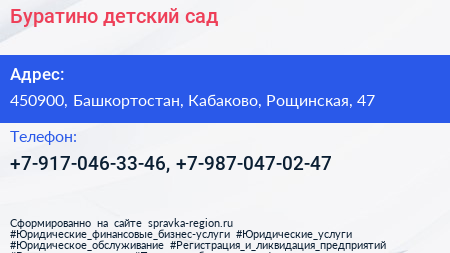 Буратино, детский сад по адресу 450900, Башкортостан, Кабаково, Рощинская, 47 в дальнейшем Организация, размещена в следующих категориях: