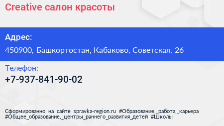 Creative, салон красоты по адресу 450900, Башкортостан, Кабаково, Советская, 26 в дальнейшем Организация, размещена в следующих категориях: