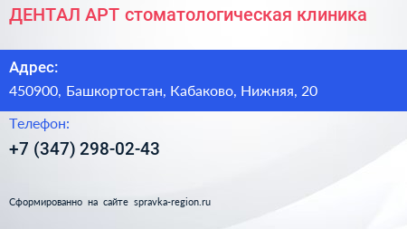 ДЕНТАЛ АРТ, стоматологическая клиника по адресу 450900, Башкортостан, Кабаково, Нижняя, 20 в дальнейшем Организация, размещена в следующих категориях: