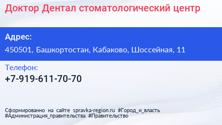 Доктор Дентал, стоматологический центр по адресу 450501, Башкортостан, Кабаково, Шоссейная, 11 в дальнейшем Организация, размещена в следующих категориях: